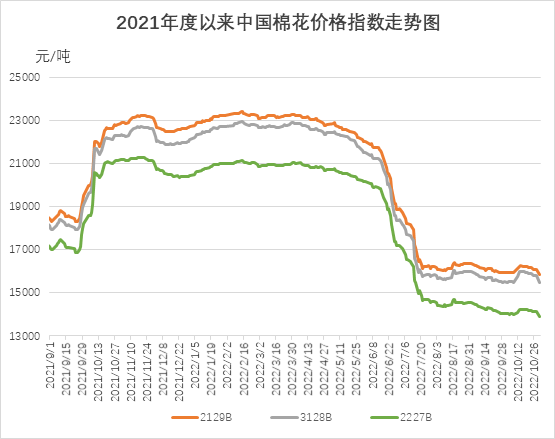 10月,新棉上市量持續(xù)增加,但受新疆等地疫情影響,部分貨運(yùn)流動(dòng)受限,加工進(jìn)度較慢,新棉上市量不及預(yù)期,國(guó)內(nèi)棉花市場(chǎng)資源供應(yīng)趨緊,現(xiàn)貨價(jià)格走勢(shì)強(qiáng)于期貨,月內(nèi)止跌企穩(wěn),棉花企業(yè)抓住時(shí)機(jī)積極銷售,內(nèi)地庫(kù)棉花資源銷售量較好。同期,紡織市場(chǎng)旺季不旺,新增訂單不足,對(duì)棉花的需求多維持就近采購(gòu),不擴(kuò)大原料庫(kù)存。月末,中國(guó)棉花價(jià)格指數(shù)(CCIndex3128B)15496元/噸,環(huán)比下跌6元;月均價(jià)15722元/噸,環(huán)比上漲38元,同比下跌2527元。