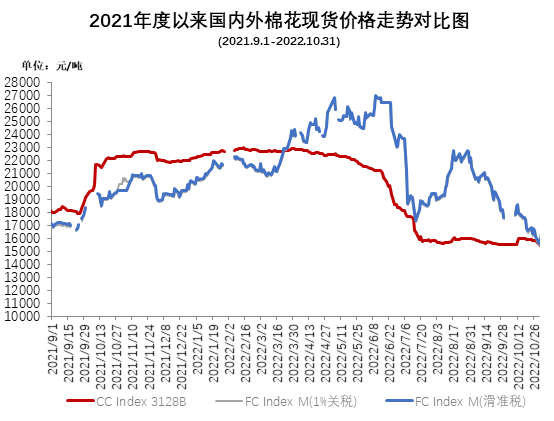 10月,受全球經(jīng)濟(jì)衰退預(yù)期升溫、月內(nèi)USDA下調(diào)全球消費(fèi)數(shù)據(jù)、美棉累計(jì)簽約持續(xù)處近年低位、加上能源及大宗商品承壓下行等影響,月內(nèi)國(guó)際棉花期現(xiàn)貨市場(chǎng)價(jià)格大幅下跌。中國(guó)進(jìn)口棉價(jià)格指數(shù)FCIndexM月均99.76美分/磅,環(huán)比下跌19.27美分;月底為90.33美分/磅,環(huán)比下跌14.52美分,1%關(guān)稅下折人民幣15445元/噸,低于同期中國(guó)棉花價(jià)格指數(shù)(CCIndex3128B)51元,內(nèi)外棉價(jià)價(jià)差繼續(xù)收窄。
