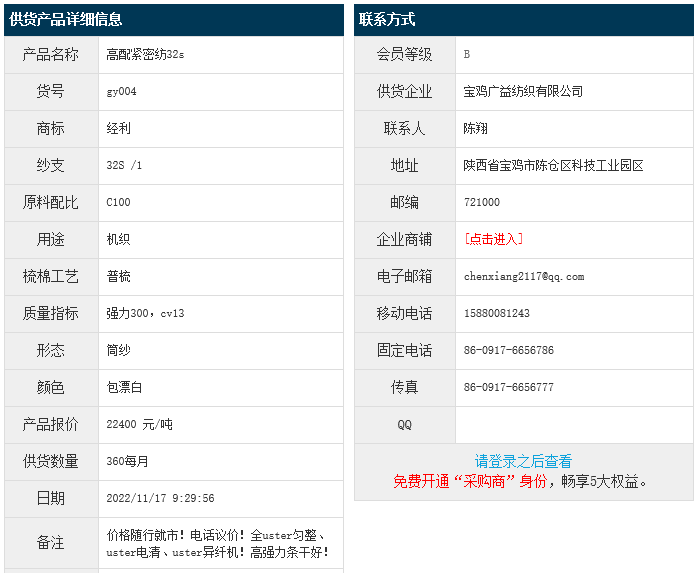 11月17日,寶雞廣益紡織有限公司高配緊密紡純棉紗C100 32S 強力300 cv13,報價為22400元/噸,實際成交價以協(xié)商為準。[點擊查看詳情]