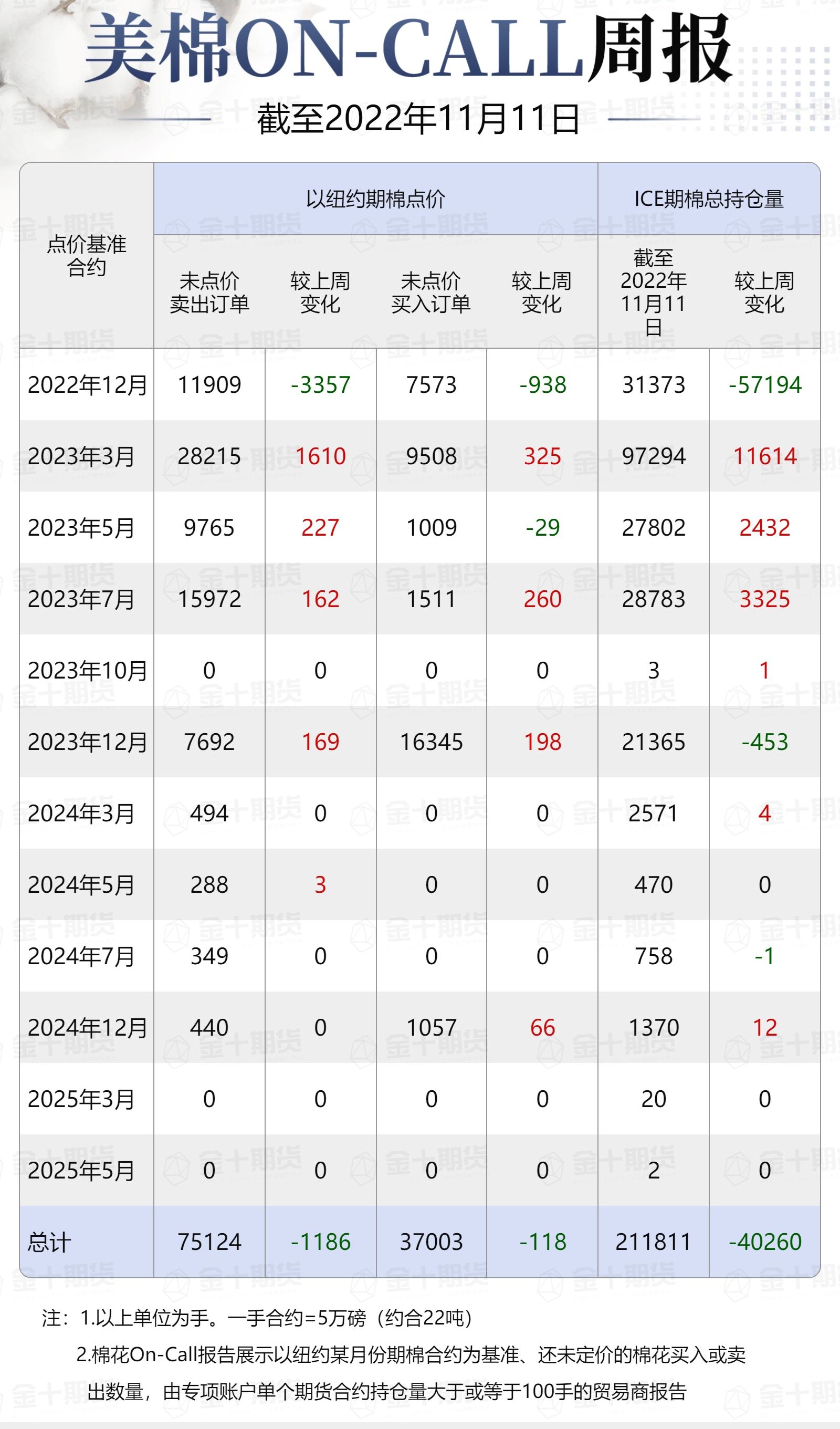 據(jù)美國(guó)商品期貨交易委員會(huì)(CFTC)最新數(shù)據(jù),截至11月11日,①美棉On-Call未點(diǎn)價(jià)賣出訂單75124手,環(huán)比減少1186手;未點(diǎn)價(jià)買入訂單37003手,環(huán)比減少118手;②ICE期棉2212合約上賣方未點(diǎn)價(jià)合約為11909手,較此前一周減少3357手;③ICE期棉2303合約上賣方未點(diǎn)價(jià)合約為28215手,較此前一周增加1610手;④ICE期棉2305合約上賣方未點(diǎn)價(jià)合約為9765手,較此前一周增加227手;⑤ICE期棉2307合約上賣方未點(diǎn)價(jià)合約為15972手,較此前一周增加162手;⑥ICE棉花期貨盤面2022/23年度(8月至次年7月)的On-Call合約未點(diǎn)價(jià)賣出訂單為65861手,環(huán)比減少1358手。