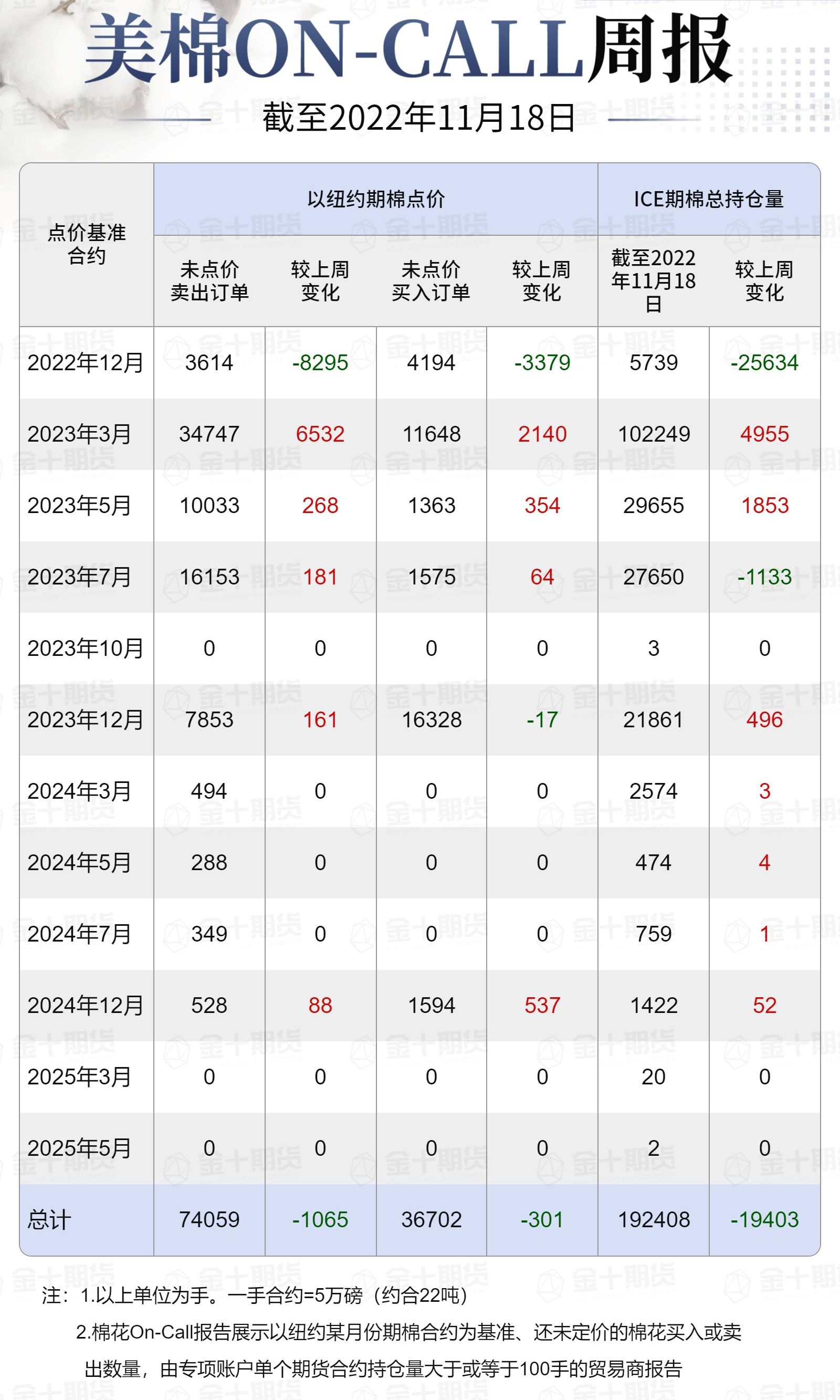 據(jù)美國商品期貨交易委員會(CFTC)最新數(shù)據(jù),截至11月18日,①美棉On-Call未點價賣出訂單74059手,環(huán)比減少1065手;未點價買入訂單36702手,環(huán)比減少301手;②ICE期棉2212合約上賣方未點價合約為3614手,較此前一周減少8295手;③ICE期棉2303合約上賣方未點價合約為34747手,較此前一周增加6532手;④ICE期棉2305合約上賣方未點價合約為10033手,較此前一周增加268手;⑤ICE期棉2307合約上賣方未點價合約為16153手,較此前一周增加181手;⑥ICE棉花期貨盤面2022/23年度(8月至次年7月)的On-Call合約未點價賣出訂單為64547手,環(huán)比減少1314手。