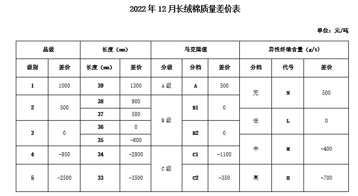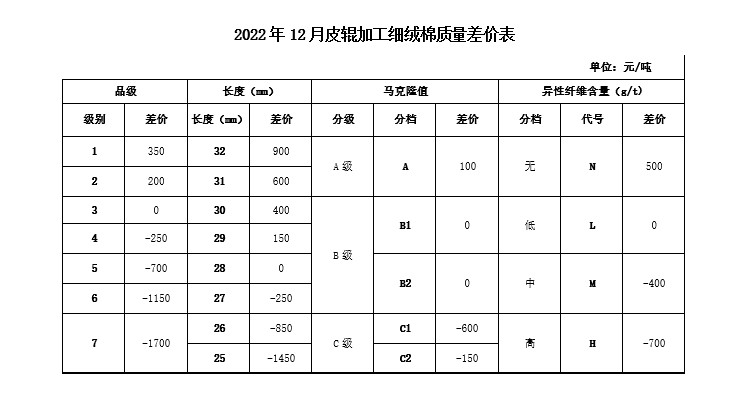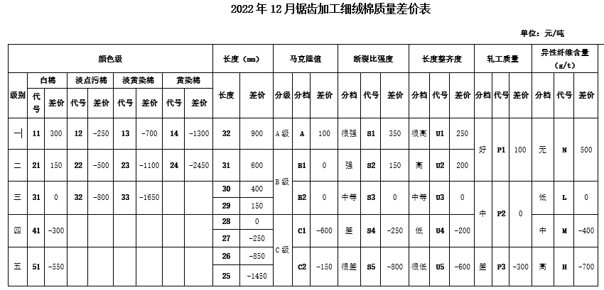 根據(jù)《中國(guó)棉花協(xié)會(huì)國(guó)產(chǎn)棉質(zhì)量差價(jià)表管理辦法》規(guī)定,現(xiàn)正式發(fā)布2022年12月《鋸齒加工細(xì)絨棉質(zhì)量差價(jià)表》、《皮輥加工細(xì)絨棉質(zhì)量差價(jià)表》和《長(zhǎng)絨棉質(zhì)量差價(jià)表》(單位:元/噸)。