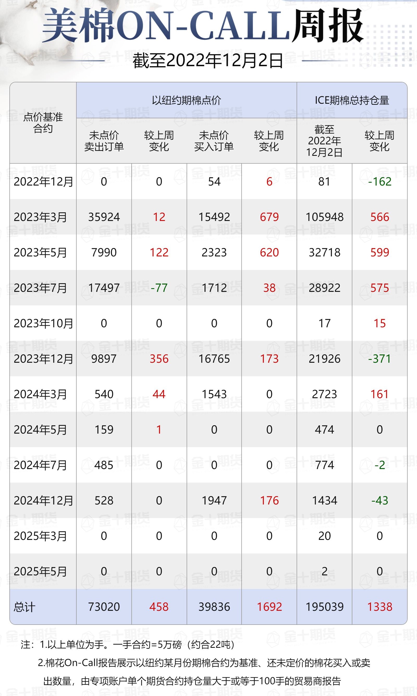 據(jù)美國(guó)商品期貨交易委員會(huì)(CFTC)最新數(shù)據(jù),截至12月2日,①美棉On-Call未點(diǎn)價(jià)賣出訂單73020手,環(huán)比增加458手;未點(diǎn)價(jià)買入訂單39836手,環(huán)比增加1692手;②ICE期棉2212合約上賣方未點(diǎn)價(jià)合約為0手,較此前一周增加0手;③ICE期棉2303合約上賣方未點(diǎn)價(jià)合約為35924手,較此前一周增加12手;④ICE期棉2305合約上賣方未點(diǎn)價(jià)合約為7990手,較此前一周增加122手;⑤ICE期棉2307合約上賣方未點(diǎn)價(jià)合約為17497手,較此前一周減少77手;⑥ICE棉花期貨盤面2022/23年度(8月至次年7月)的On-Call合約未點(diǎn)價(jià)賣出訂單為61411手,環(huán)比增加57手。