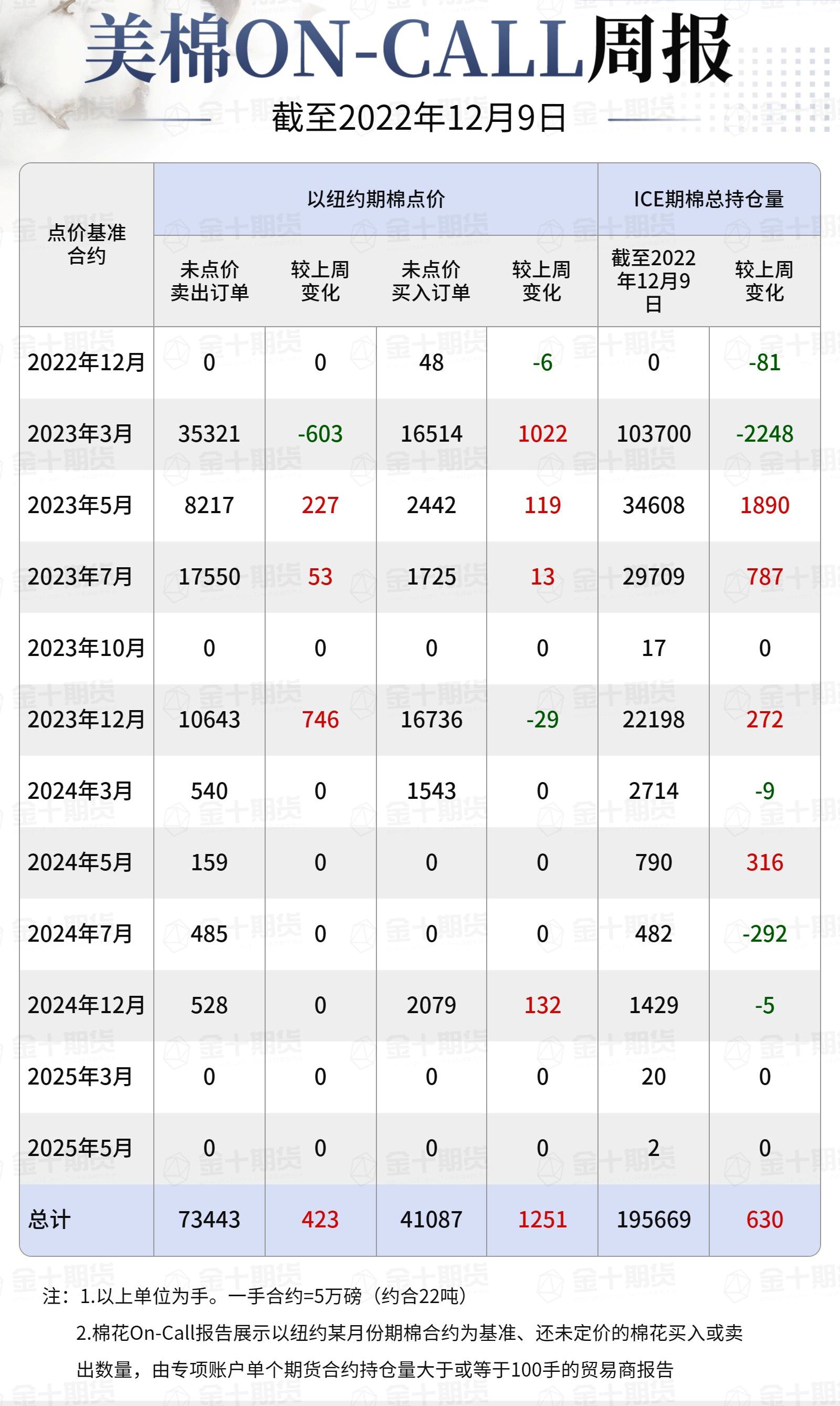 據(jù)美國(guó)商品期貨交易委員會(huì)(CFTC)最新數(shù)據(jù),截至12月9日,①美棉On-Call未點(diǎn)價(jià)賣出訂單73443手,環(huán)比增加423手;未點(diǎn)價(jià)買入訂單41087手,環(huán)比增加1251手;②ICE期棉2212合約上賣方未點(diǎn)價(jià)合約為0手,較此前一周增加0手;③ICE期棉2303合約上賣方未點(diǎn)價(jià)合約為35321手,較此前一周減少603手;④ICE期棉2305合約上賣方未點(diǎn)價(jià)合約為8217手,較此前一周增加227手;⑤ICE期棉2307合約上賣方未點(diǎn)價(jià)合約為17550手,較此前一周增加53手;⑥ICE棉花期貨盤面2022/23年度(8月至次年7月)的On-Call合約未點(diǎn)價(jià)賣出訂單為61088手,環(huán)比減少323手。