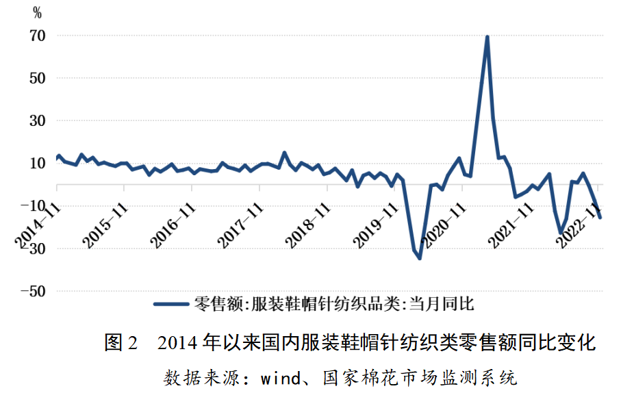 11月國內經濟受到多重沖擊。據國家統(tǒng)計局數(shù)據顯示,11月規(guī)模以上工業(yè)增加值同比增長2.2%,比上月回落2.8個百分點,其中紡織業(yè)下降4.7%。生產下滑受多重因素影響,一是國內疫情反彈、工業(yè)生產循環(huán)受到沖擊的原因,二是世界經濟收縮放緩、出口下滑拖累,三是企業(yè)產銷銜接不暢、經營困難增多等因素。但從1-11月看,工業(yè)生產保持總體穩(wěn)定,規(guī)模以上工業(yè)增加值同比增長3.8%。受新冠疫情等因素沖擊,11月消費明顯承壓,市場銷售降幅有所擴大。11月社會消費品零售總額同比下降5.9%,較10月-0.5%降速有所擴大。