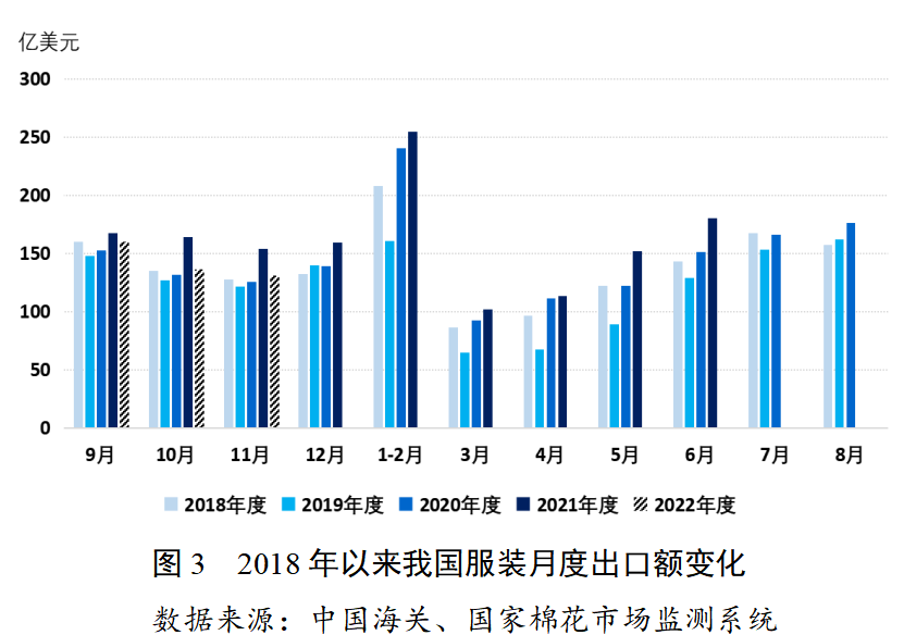 11月我國服裝出口繼續(xù)負增長。據海關數(shù)據顯示,我國服裝出口繼2022年9月、10月轉向負增長后,11月繼續(xù)下行,11月單月服裝出口額131.2億美元,同比下降14.9%,是自2020年12月后出現(xiàn)負增長的第3個月,但較10月-17%降幅稍有收窄。在需求萎縮大環(huán)境下,部分地區(qū)政企合力出海詢單,努力開拓市場爭取更多訂單。
