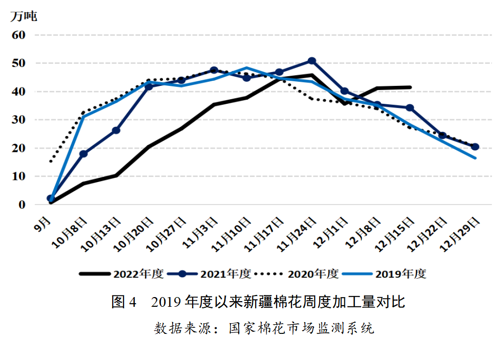 新棉供應進度加快,加工量接近370萬噸。隨著新疆棉花加工和公檢進度持續(xù)推進,新棉上市量逐漸增加。按照國內棉花預計產量613.8萬噸測算,截至12月15日全國累計加工皮棉367.3萬噸,同比減少90.2萬噸,其中新疆加工346.6萬噸;全國累計公證檢驗199.72萬噸,同比下降48.4%,其中新疆196.38萬噸。
