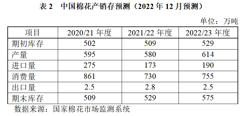 基于相關專題調查和對國內外經濟環(huán)境及市場狀況的分析,本期國家棉花市場監(jiān)測系統(tǒng)對2022/23年度中國棉花產銷存預測維持上月觀點如下: