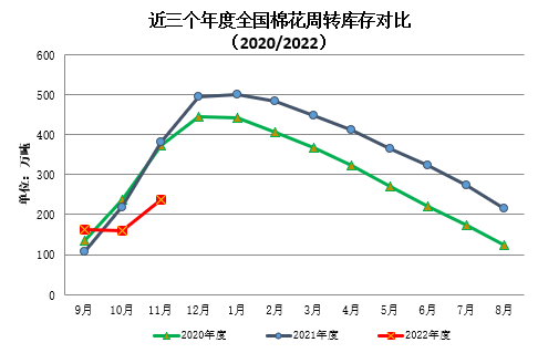 11月,新棉上市量增加,全國棉市資源供應充裕。紡織廠新增訂單較少,開機率略下降,棉花采購多隨用隨買,僅適量補充庫存。國內棉花周轉庫存大幅增加,增幅環(huán)比擴大,但仍大幅低于去年同期,主要是由于新疆疫情影響加工進度。據(jù)中國棉花協(xié)會棉花物流分會對全國棉花交易市場18個省市的154家棉花交割和監(jiān)管倉庫的調查數(shù)據(jù)顯示,11月底全國棉花周轉庫存總量約237.13萬噸,環(huán)比增加76.15萬噸,增幅47.30%,低于去年同期144.8萬噸。