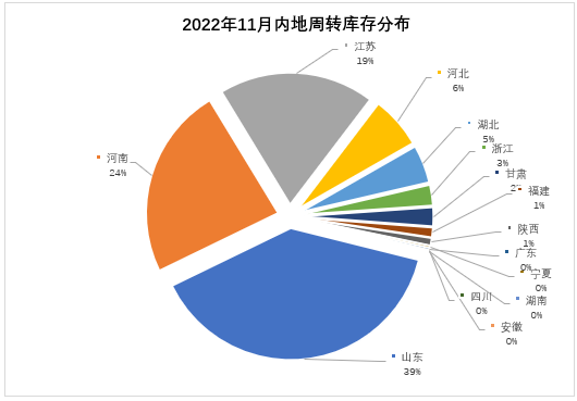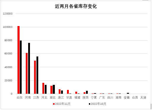 分省份看,山東省庫存量居首位為10.13萬噸,河南省次之為6.12萬噸,江蘇省居第三位為4.96萬噸,河北省為1.66萬噸,湖北省為1.21萬噸,浙江省0.66萬噸,甘肅省0.60萬噸,福建省0.31萬噸,其他省均在2千噸以下。