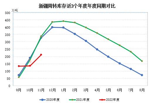 截至11月底,新疆43家倉庫商品棉周轉庫存211.09萬噸,環(huán)比增加75.37萬噸,增幅環(huán)比擴大;同比減少125.19萬噸。