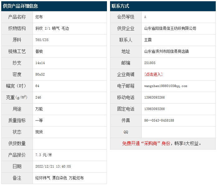 12月21日,山東陽(yáng)信縣信王紡織有限公司滌棉斜紋T65/C35 14xOE14 80x52 64" 2/1 246g/㎡ 噴氣 毛邊,報(bào)價(jià)為7.3元/米,實(shí)際成交價(jià)以協(xié)商為準(zhǔn)。[點(diǎn)擊查看詳情]