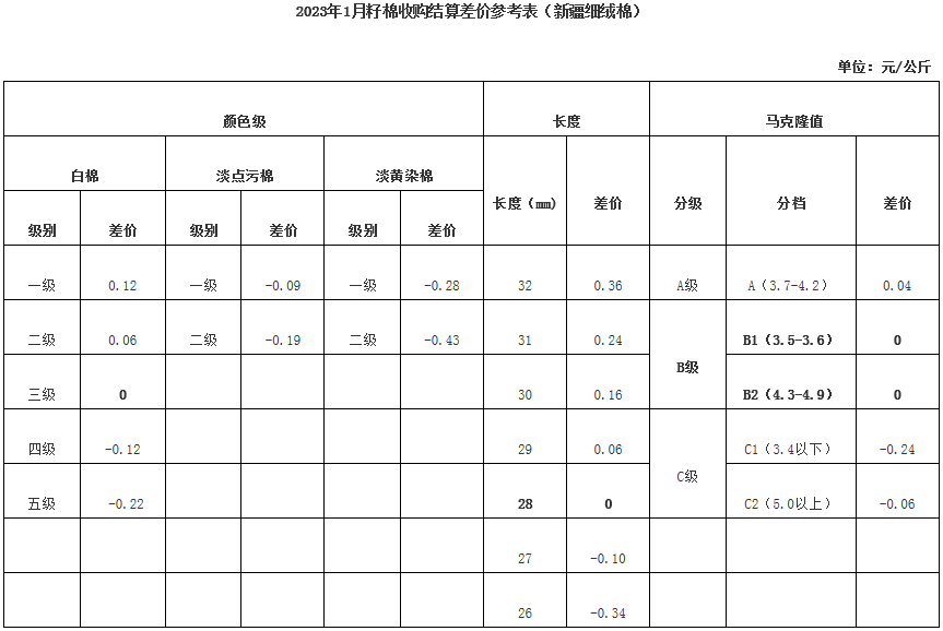 依據(jù)中國棉花協(xié)會發(fā)布的2023年1月《鋸齒加工細(xì)絨棉質(zhì)量差價表》和中國棉花預(yù)警系統(tǒng)2022年9-12月新疆籽棉收購平均衣分率數(shù)據(jù),折算得出籽棉收購差價,現(xiàn)正式發(fā)布2023年1月《籽棉收購結(jié)算差價參考表(新疆細(xì)絨棉)》(單位:元/公斤),為新疆地區(qū)籽棉收購工作提供參考。