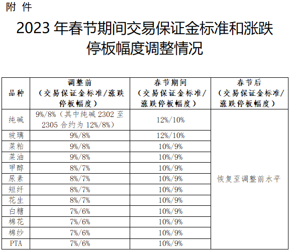 根據(jù)《鄭州商品交易所期貨交易風(fēng)險控制管理辦法》第八條規(guī)定,經(jīng)研究決定,對2023年春節(jié)期間部分期貨合約交易保證金標(biāo)準(zhǔn)和漲跌停板幅度作出如下調(diào)整: