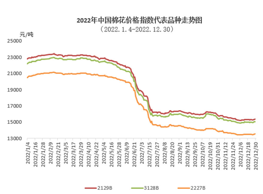 12月,國內(nèi)疫情防控政策進(jìn)一步優(yōu)化,月中下旬疫情高峰過后,市場信心有所提振,國內(nèi)鄭棉持續(xù)反彈,主力合約最高漲至近3個(gè)月高位;棉企積極銷售,疆棉出疆量大幅增加,月中下旬受期貨上漲帶動(dòng)現(xiàn)貨價(jià)格逐漸上漲,同時(shí),臨近年底紡織廠有傳統(tǒng)備貨需求,市場購銷進(jìn)度月中下旬好于月初,國內(nèi)棉價(jià)指數(shù)先跌后漲,但月均價(jià)較上月仍有下跌。月末,中國棉花價(jià)格指數(shù)(CCIndex3128B)15046元/噸,環(huán)比上漲73元;月均價(jià)14970元/噸,環(huán)比下跌259元,同比下跌6988元。