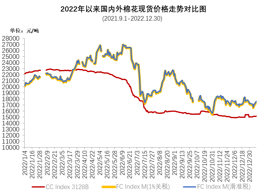 12月,國內(nèi)疫情防控政策優(yōu)化調(diào)整,下游需求復(fù)蘇預(yù)期提高行業(yè)信心,月中下旬期貨價(jià)格持續(xù)反彈,皮棉及棉紗價(jià)格小幅跟漲。紡織行業(yè)按慣例應(yīng)在元旦及春節(jié)前開始備貨,但月初因工人陸續(xù)感染,不能及時(shí)復(fù)崗,新增訂單增量較少,企業(yè)整體開工率仍顯不足,原料需求隨用隨購,月中下旬逐漸好轉(zhuǎn),整體購銷進(jìn)度略有提升。同期,國際棉價(jià)先揚(yáng)后抑再反彈,月底仍高于國內(nèi)棉價(jià),內(nèi)外價(jià)差繼續(xù)擴(kuò)大。