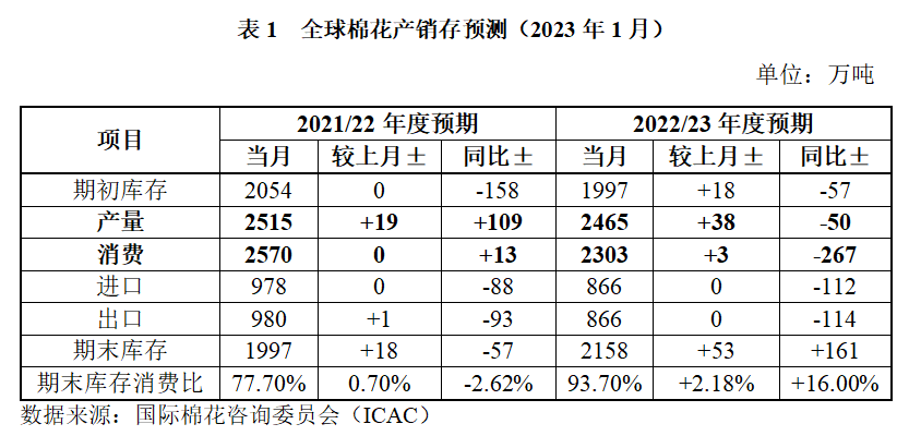 2023年1月國(guó)際棉花咨詢委員會(huì)發(fā)布全球棉花產(chǎn)銷存預(yù)測(cè)數(shù)據(jù)顯示,2022年度全球棉花產(chǎn)量2465萬(wàn)噸,環(huán)比調(diào)增1.58%,同比下降1.99%;消費(fèi)量2303萬(wàn)噸,環(huán)比調(diào)增0.13%,同比下降10.39%;期末庫(kù)存2158萬(wàn)噸,環(huán)比調(diào)增2.52%,同比增加8.06%;產(chǎn)大于需162萬(wàn)噸,分國(guó)家看,美棉、巴基斯坦預(yù)期減產(chǎn)合計(jì)103萬(wàn)噸,中國(guó)、印度、巴西、烏茲別克斯坦增產(chǎn)合計(jì)94萬(wàn)噸,大部分棉花主要消費(fèi)國(guó)消費(fèi)量明顯萎縮,導(dǎo)致期末庫(kù)存消費(fèi)比同比增加16個(gè)百分點(diǎn)至93.70%,接近貿(mào)易摩擦和疫情疊加的2019棉花年度95.97%的水平。