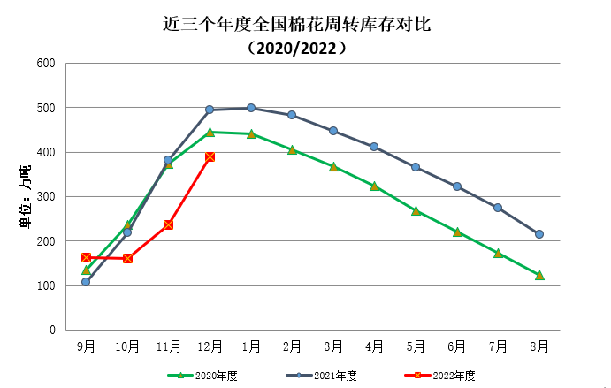 12月,國內(nèi)疫情優(yōu)化調(diào)整,新棉上市資源量繼續(xù)增加,全國棉市資源供應(yīng)充裕,紡織廠訂單增量較少,整體開工率仍不足,因年底補庫慣例,月中下旬對棉花需求有所回暖。國內(nèi)棉花周轉(zhuǎn)庫存大幅增加,增幅環(huán)比擴大,但仍低于去年同期。據(jù)中國棉花協(xié)會棉花物流分會對全國棉花交易市場18個省市的154家棉花交割和監(jiān)管倉庫的調(diào)查數(shù)據(jù)顯示,12月底全國棉花周轉(zhuǎn)庫存總量約388.55萬噸,環(huán)比增加151.42萬噸,增幅63.86%,低于去年同期105.6萬噸。
