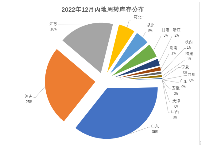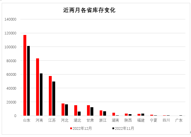 分省份看,山東省庫存量首位11.71萬噸,河南省次之8.29萬噸,江蘇省第三位5.75萬噸,河北省1.78萬噸,湖北省1.51萬噸,甘肅省1.50萬噸,其他省均在1萬噸以下。