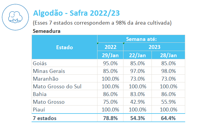 據(jù)巴西農(nóng)業(yè)部下屬的國家商品供應(yīng)公司CONAB,截至1月28日,巴西棉花播種率為64.4%,上周為54.3%,去年同期為78.8%。