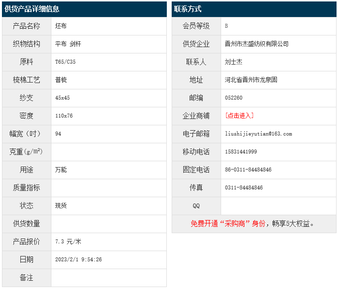 2月1日,晉州杰盛紡織有限公司滌棉平布T65/C35 45x45 110x76 94" 劍桿,報(bào)價(jià)為7.3元/米,實(shí)際成交價(jià)以協(xié)商為準(zhǔn)。[點(diǎn)擊查看詳情]