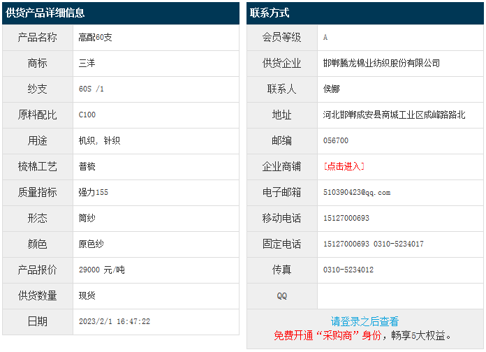 2月1日,邯鄲騰龍棉業(yè)紡織股份有限公司高配純棉紗C100 60S 強力155,報價為29000元/噸,實際成交價以協(xié)商為準。[點擊查看詳情]