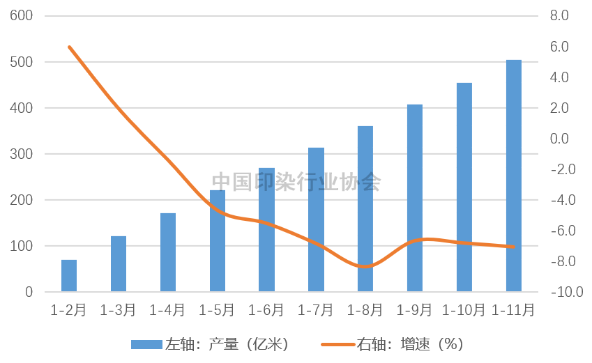 圖1 2022年以來規(guī)模以上印染企業(yè)印染布產(chǎn)量及增速情況