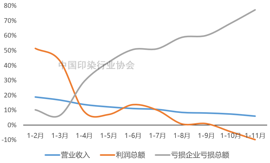 1-11月行業(yè)營業(yè)收入保持增長,但增速呈現(xiàn)“前高后低”態(tài)勢。利潤總額增速整體呈現(xiàn)下滑態(tài)勢,1-11月利潤總額增速降幅較1-10月擴大5.30個百分點,虧損企業(yè)虧損總額大幅增長,反映出在多重不利因素影響下,印染企業(yè)經(jīng)營壓力明顯加大,行業(yè)運行效益有待改善。