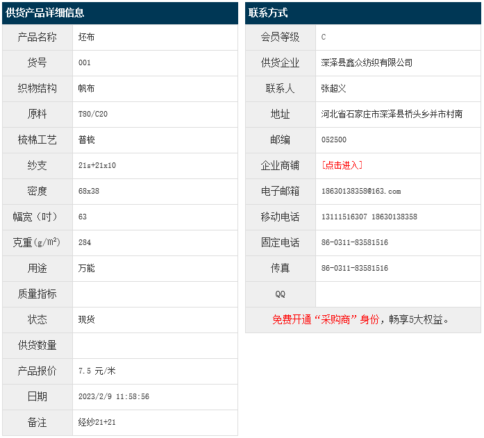 2月9日,深澤縣鑫眾紡織有限公司滌棉帆布T80/C20 21+21x10 68x38 63" 284g/㎡,報價為7.5元/米,實際成交價以協(xié)商為準。[點擊查看詳情]