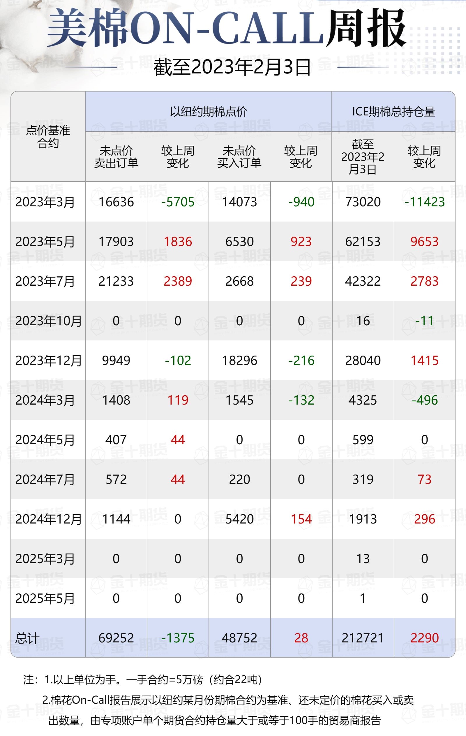 據美國商品期貨交易委員會(CFTC)最新數據,截至2月3日,①美棉On-Call未點價賣出訂單69252手,環(huán)比減少1375手;未點價買入訂單48752手,環(huán)比增加28手;②ICE期棉2303合約上賣方未點價合約為16636手,較此前一周減少5705手;③ICE期棉2305合約上賣方未點價合約為17903手,較此前一周增加1836手;④ICE期棉2307合約上賣方未點價合約為21233手,較此前一周增加2389手;⑤ICE棉花期貨盤面2022/23年度(8月至次年7月)的On-Call合約未點價賣出訂單為55772手,環(huán)比減少1480手。