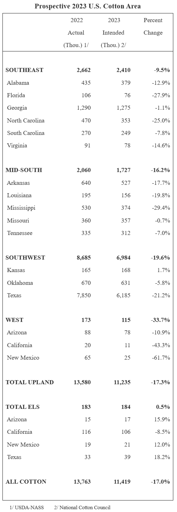 據美國國家棉花委員會(NCC)第42次年度早期種植意向調查,美國棉花生產商計劃今年春季種植1141.9萬英畝棉花,比2022年減少17%。陸地棉意向1123.5萬英畝,比2022年減少17.3%,超長纖維棉(ELS)種植意向18.4萬英畝,增長0.5%。