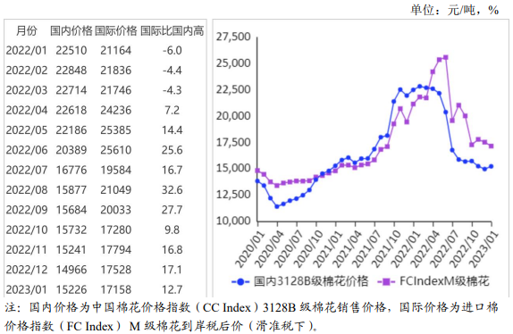 (一)國(guó)內(nèi)棉價(jià)環(huán)比上漲。本月,國(guó)內(nèi)疫情形勢(shì)逐步好轉(zhuǎn),市場(chǎng)信心逐步恢復(fù),紡織廠原料采購(gòu)意愿增強(qiáng)。據(jù)《中國(guó)棉花工業(yè)庫(kù)存調(diào)查報(bào)告》數(shù)據(jù),2023年1月初,準(zhǔn)備采購(gòu)棉花的企業(yè)占58%,環(huán)比增加0.2個(gè)百分點(diǎn),同比增加8.0個(gè)百分點(diǎn)。1月,國(guó)內(nèi)3128B級(jí)棉花月均價(jià)每噸15226元,環(huán)比漲1.7%,同比跌32.4%。鄭棉期貨主力合約(CF305)月結(jié)算價(jià)每噸14850元,環(huán)比漲7.7%,同比跌30.5%。
