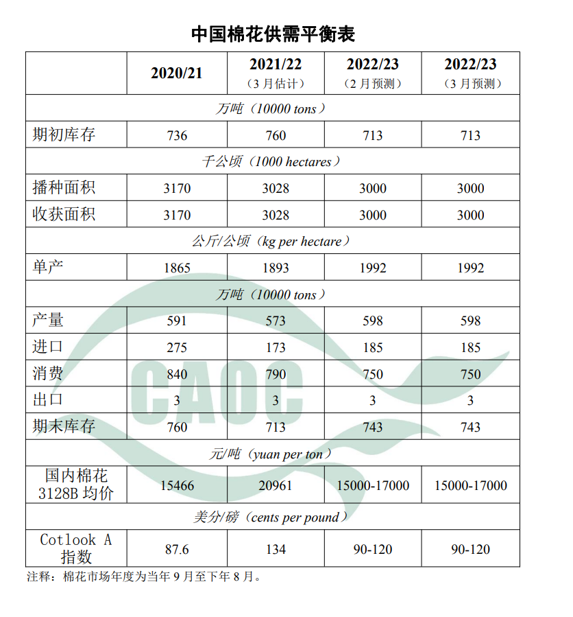 本月對2022/23年度預(yù)測數(shù)據(jù)不作調(diào)整。國內(nèi)經(jīng)濟(jì)穩(wěn)步復(fù)蘇,下游紡織品服裝消費(fèi)預(yù)期增強(qiáng),棉花銷售進(jìn)度明顯加快。據(jù)國家棉花市場監(jiān)測系統(tǒng)數(shù)據(jù),截至3月2日,全國新棉銷售率為53.0%,同比提高13.7個(gè)百分點(diǎn)。考慮到棉花供應(yīng)總體充足,“金三銀四”消費(fèi)回暖情況有待觀察,棉價(jià)暫維持上月預(yù)測值不變。