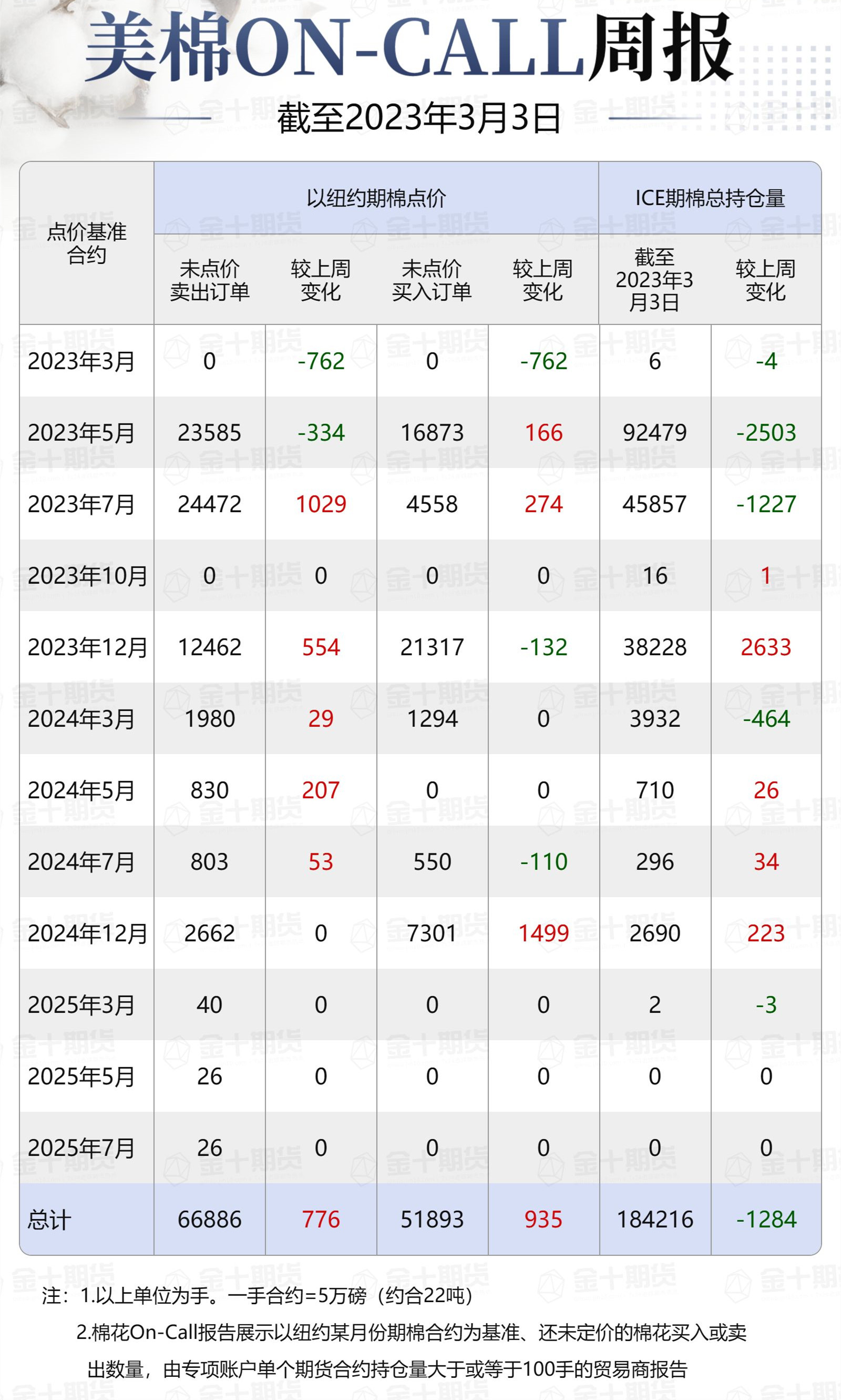 據(jù)美國商品期貨交易委員會(CFTC)最新數(shù)據(jù),截至3月3日,①美棉On-Call未點價賣出訂單66886手,環(huán)比增加776手;未點價買入訂單51893手,環(huán)比增加935手;②ICE期棉2303合約上賣方未點價合約為0手,較此前一周減少762手;③ICE期棉2305合約上賣方未點價合約為23585手,較此前一周減少334手;④ICE期棉2307合約上賣方未點價合約為24472手,較此前一周增加1029手;⑤ICE棉花期貨盤面2022/23年度(8月至次年7月)的On-Call合約未點價賣出訂單為48057手,環(huán)比減少67手。