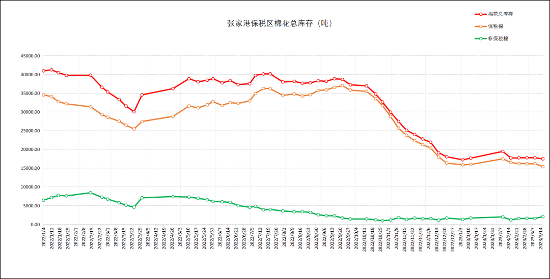 據(jù)張家港保稅區(qū)紡織原料市場統(tǒng)計,截至3月16日當周,#張家港保稅區(qū)棉花總庫存#1.75萬噸,環(huán)比減少1.62%;其中#保稅棉#1.54萬噸,環(huán)比減少0.29%,#非保稅棉#0.2萬噸,環(huán)比增加31.72%。當周#張家港保稅區(qū)棉花庫存#中,出庫898噸,入庫1025噸,凈入庫127噸。
