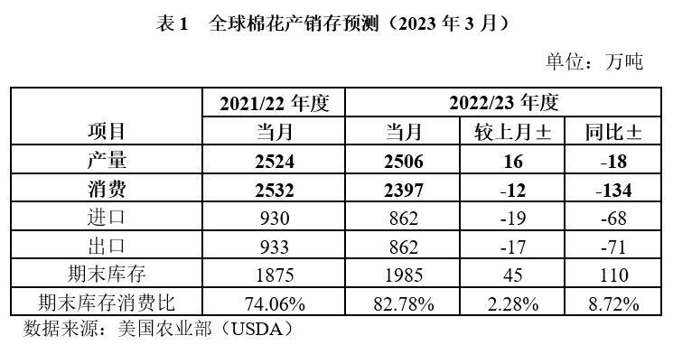 據(jù)美國(guó)農(nóng)業(yè)部(USDA)2023年3月發(fā)布的全球棉花產(chǎn)銷存預(yù)測(cè)數(shù)據(jù),2022年度全球棉花產(chǎn)量為2506萬噸,環(huán)比調(diào)增0.63%,同比降幅收窄至0.70%;消費(fèi)量2397萬噸,環(huán)比下降0.50%,同比降幅擴(kuò)大至5.30%;期末庫(kù)存1984.5萬噸,環(huán)比調(diào)增0.23%,同比增加8.31%;產(chǎn)大于需109萬噸。分國(guó)家看,美國(guó)、巴基斯坦、澳大利亞預(yù)期減產(chǎn)合計(jì)113萬噸,中國(guó)、印度、巴西、土耳其增產(chǎn)合計(jì)119萬噸;除中國(guó)外,大部分主要棉花消費(fèi)國(guó)消費(fèi)量預(yù)期萎縮,導(dǎo)致期末庫(kù)存消費(fèi)比同比增加8.72個(gè)百分點(diǎn)至82.78%,創(chuàng)2014年度以來最高水平(剔除受貿(mào)易摩擦和疫情雙重影響的2019年度數(shù)據(jù))。