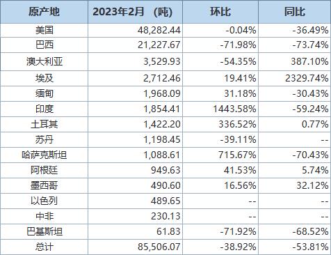 2023年2月我國(guó)進(jìn)口棉花約9萬(wàn)噸,環(huán)比減少約5萬(wàn)噸,同比下降約53.8%。