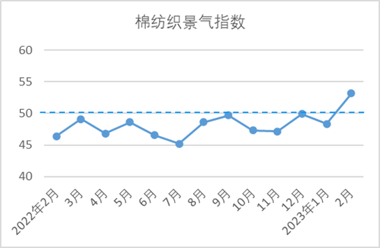 說明:中國棉紡織行業(yè)景氣指數(shù)采集自全國近500家次棉紡織企業(yè),參考國家制造業(yè)PMI等指數(shù)制定方式,通過對多個主要指標加權計算得出,當指數(shù)高于50,表示棉紡織行業(yè)本月景氣程度好于上月,低于50則表示本月景氣程度不及上月。