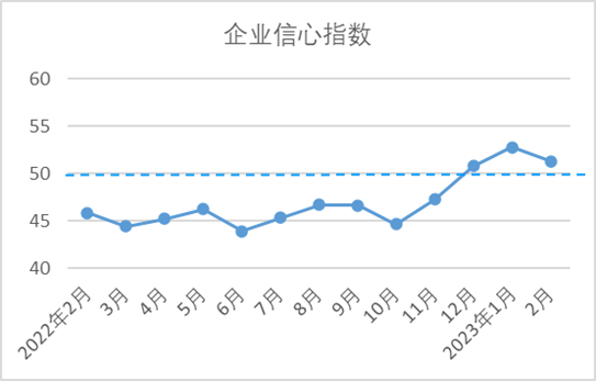 2月,企業(yè)信心指數(shù)為51.3,較1月下降1.45,依舊處擴張區(qū)間。當前國際環(huán)境依然復雜,主要經(jīng)濟體通脹、地緣政治等不穩(wěn)定不確定因素較多,世界經(jīng)濟增長趨于放緩,外貿(mào)市場有待考量。國內(nèi)經(jīng)濟開春以來活力涌動,但依然處在恢復階段,如何擴大內(nèi)需仍是關注的重點。在此背景下,穩(wěn)定市場預期,進一步提振市場信心十分重要。