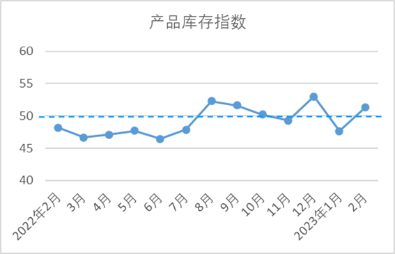 2月,原料庫存指數(shù)為51.13,較1月下降0.8,繼續(xù)位于榮枯線上方。隨著下游需求回暖,企業(yè)增加原料庫存,以保證正常生產(chǎn)使用。但由于原料價格波動頻繁,為規(guī)避風險,企業(yè)原料庫存量控制在一定范圍內(nèi)。從分項指數(shù)看,棉花庫存量指數(shù)51.61,與1月持平;非棉纖維庫存量指數(shù)50.66,較1月下降1.6。