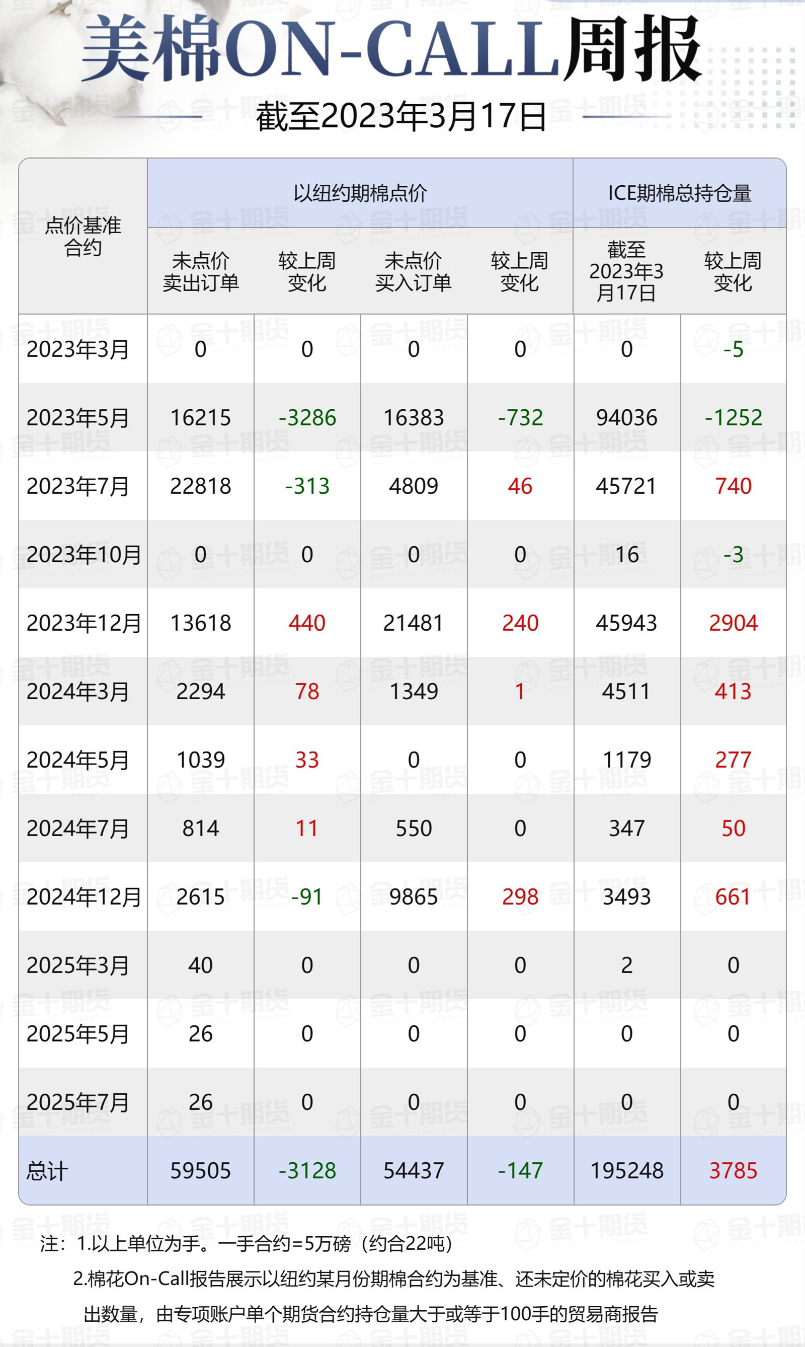 據(jù)美國商品期貨交易委員會(CFTC)最新數(shù)據(jù),截至3月17日,①美棉On-Call未點(diǎn)價(jià)賣出訂單59505手,環(huán)比減少3128手;未點(diǎn)價(jià)買入訂單54437手,環(huán)比減少147手;②ICE期棉2303合約上賣方未點(diǎn)價(jià)合約為0手,較此前一周增加0手;③ICE期棉2305合約上賣方未點(diǎn)價(jià)合約為16215手,較此前一周減少3286手;④ICE期棉2307合約上賣方未點(diǎn)價(jià)合約為22818手,較此前一周減少313手;⑤ICE棉花期貨盤面2022/23年度(8月至次年7月)的On-Call合約未點(diǎn)價(jià)賣出訂單為39033手,環(huán)比減少3599手。