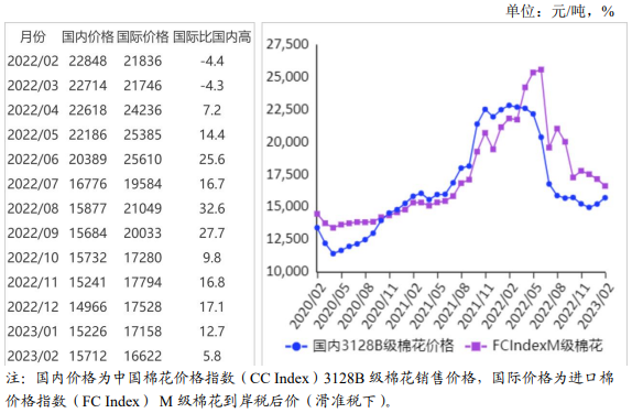 (一)國內(nèi)棉價環(huán)比上漲。本月,國內(nèi)經(jīng)濟穩(wěn)步復(fù)蘇,中國制造業(yè)采購經(jīng)理指數(shù)(PMI)強勁回升至52.6%。紡織廠陸續(xù)開工復(fù)產(chǎn),原料采購意愿增強。據(jù)《中國棉花工業(yè)庫存調(diào)查報告》數(shù)據(jù),2023年2月初,準備采購棉花的企業(yè)占59.4%,環(huán)比增加1.4個百分點,同比增加2.8個百分點。2月,國內(nèi)3128B級棉花月均價每噸15712元,環(huán)比漲3.2%,同比跌31.2%。鄭棉期貨主力合約(CF305)月結(jié)算價每噸14295元,環(huán)比跌3.7%,同比跌33.5%。
