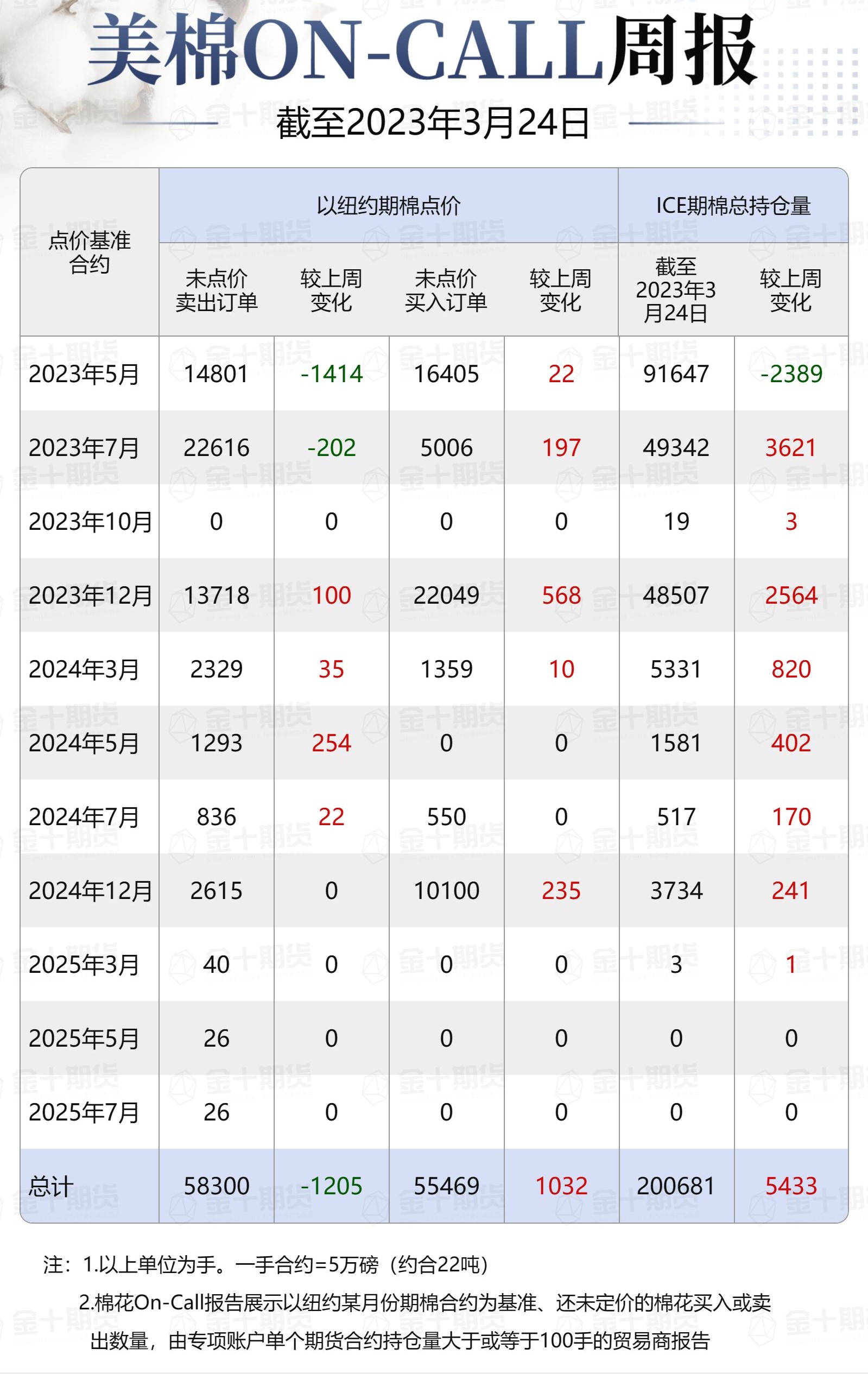 據(jù)美國商品期貨交易委員會(CFTC)最新數(shù)據(jù),截至3月24日,①美棉On-Call未點(diǎn)價賣出訂單58300手,環(huán)比減少1205手;未點(diǎn)價買入訂單55469手,環(huán)比增加1032手;②ICE期棉2305合約上賣方未點(diǎn)價合約為14801手,較此前一周減少1414手;③ICE期棉2307合約上賣方未點(diǎn)價合約為22616手,較此前一周減少202手;④ICE棉花期貨盤面2022/23年度(8月至次年7月)的On-Call合約未點(diǎn)價賣出訂單為37417手,環(huán)比減少1616手。