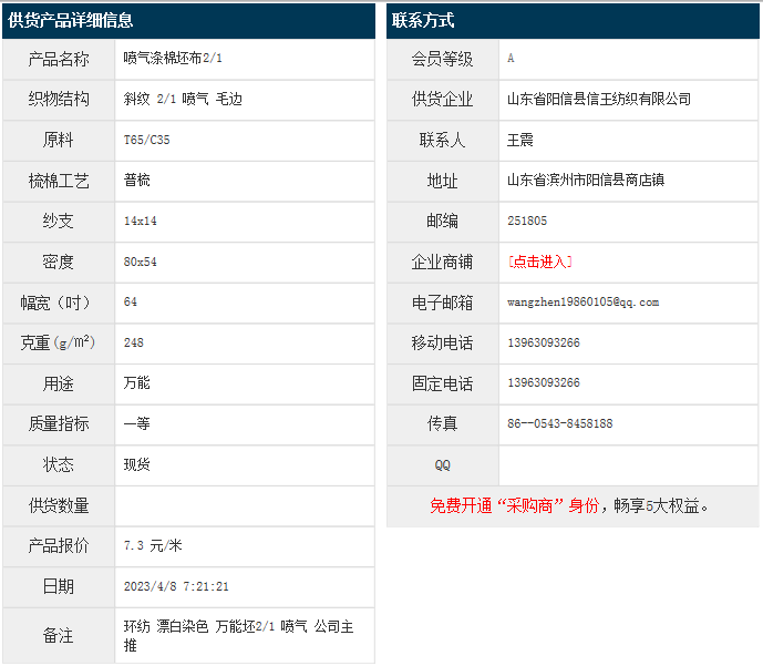 4月8日,山東陽(yáng)信縣信王紡織有限公司滌棉布T65/C35 14x14 80x54 64" 斜紋2/1 248g/㎡ 噴氣 毛邊,報(bào)價(jià)為7.3元/米,實(shí)際成交價(jià)以協(xié)商為準(zhǔn)。[點(diǎn)擊查看詳情]