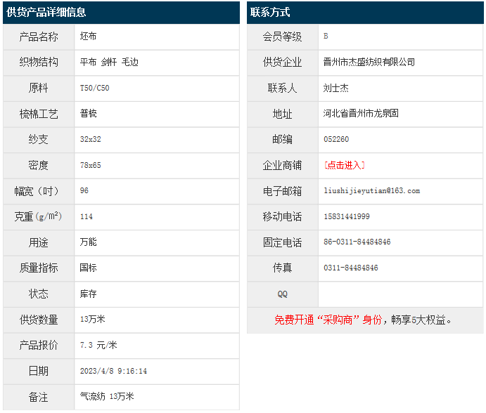 4月8日,晉州杰盛紡織有限公司滌棉布OET50/C50 32x32 78x65 96" 平布 114g/㎡ 劍桿 毛邊,報價為7.3元/米,實際成交價以協(xié)商為準(zhǔn)。[點(diǎn)擊查看詳情]