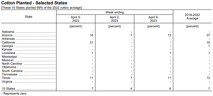 美國(guó)農(nóng)業(yè)部4月10日發(fā)布的美國(guó)棉花生長(zhǎng)報(bào)告顯示,截至4月9日當(dāng)周,美棉種植率為6%,前周為4%,去年同期為7%,五年均值為7%。