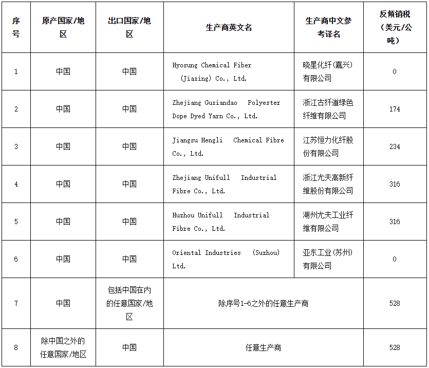 2023年4月6日,印度商工部發(fā)布公告稱,對原產于或進口自中國的聚酯高彈力紗(HighTenacityPolyesterYarn)作出第一次反傾銷日落復審肯定性終裁,建議繼續(xù)對中國涉案產品征收為期5年的反傾銷稅,稅額為0~528美元/公噸(征稅詳情見附表)。涉案產品的印度海關編碼為54022090。本案反傾銷措施不適用于以下產品:小于1000旦的紗線,大于6000旦的紗線,捻線,彩色紗線,大于1000旦的粘合活性紗線及高模低縮(HMLS)性能的紗線。