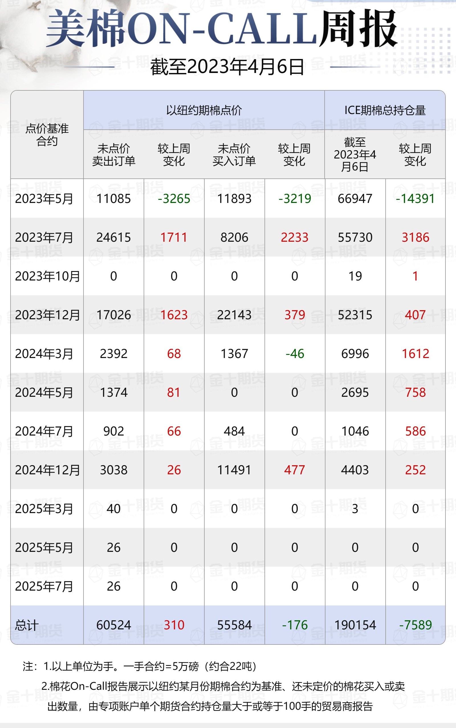 據(jù)美國(guó)商品期貨交易委員會(huì)(CFTC)最新數(shù)據(jù),截至4月6日,①美棉On-Call未點(diǎn)價(jià)賣出訂單60524手,環(huán)比增加310手;未點(diǎn)價(jià)買入訂單55584手,環(huán)比減少176手;②ICE期棉2305合約上賣方未點(diǎn)價(jià)合約為11085手,較此前一周減少3265手;③ICE期棉2307合約上賣方未點(diǎn)價(jià)合約為24615手,較此前一周增加1711手;④ICE棉花期貨盤(pán)面2022/23年度(8月至次年7月)的On-Call合約未點(diǎn)價(jià)賣出訂單為35700手,環(huán)比減少1554手。