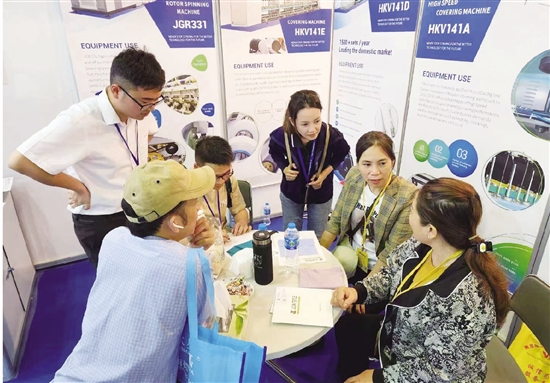 展會上,“精工智能紡機(jī)”融入越南當(dāng)?shù)禺a(chǎn)業(yè)特色,重點展示HKV141系列包覆絲機(jī)、JGT1000系列假捻變形機(jī)、JGR系列轉(zhuǎn)杯紡紗機(jī)等產(chǎn)品,吸引來自泰國、越南等多個國家的客商,雙方交流最新的市場信息和企業(yè)需求。
