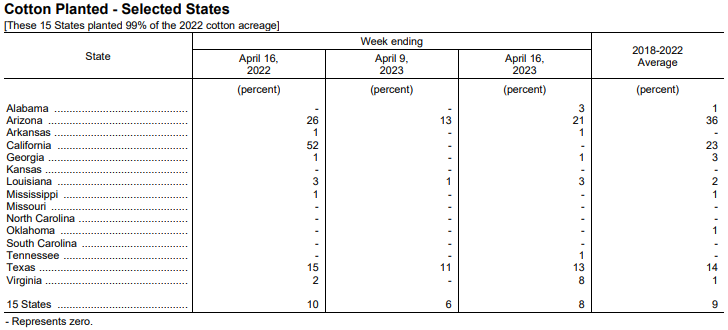 美國農(nóng)業(yè)部4月17日發(fā)布的美國棉花生長報告顯示,截至4月16日當(dāng)周,美棉種植率為8%,前周為6%,去年同期為10%,五年均值為9%。